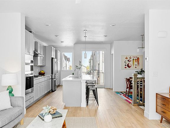 Immaculate, like new 2-bedroom + office, 4-bathroom townhome in sought after Station 53 neighborhood in Wheat Ridge! Walking into this home you will be greeted with beautiful luxury vinyl planking floors throughout the first and second floor. The third bedroom/office is perfect for the work at home professional or secluded guest retreat with adjacent fourth bath (Murphy bed negotiable!). Avoid inclement weather with secure and easy access to the attached 2-car garage on the main floor as well. The modern, open floor plan on the second floor has an inviting living room, kitchen, and dining area with tall ceilings and tons of natural light from windows on both sides. The updated kitchen has stainless steel appliances, a gas range and vent hood, quartz countertops, tile to the ceiling backsplash, and a large island. Enjoy the sunshine and coffee on the covered balcony just off the kitchen area. A powder bath is located off the kitchen and dining area as well. Upstairs the large primary bedroom boasts an en suite 3/4 bath plus a walk-in closet. The second bedroom has views of the prairie with access to a full bathroom across the hall. You will also find a laundry closet with two additional closets for extra storage on the third floor. To top it off, this home is better than new construction (only 2.5 years old) as it has all appliances, custom window treatments, and landscaping, CAT6 ethernet hardwire in the first floor office (great for working from home), a tankless water heater, and a sump pump. Taxes are significantly lower here with no special taxing district compared to other homes nearby! Home is within walking distance to great parks and Stenger soccer fields, is just a short drive to Olde Town Arvada, light rail, North Table Mountain, Golden, Clear Creek Greenbelt, Van Bibber Creek trail for walking and biking. Enjoy easy access to I-70, C-470, the airport and beyond. Wonderful neighbors await you to make this your new home!