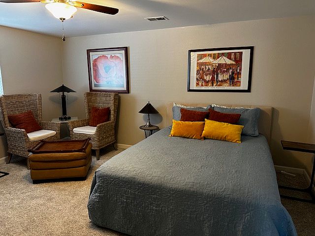 Lease term is negotiable, and all utilities included in rent. Pets are welcome with negotiation. This apartment is connected to the main house, with a separate private entrance on the backside of the house. It is a garden level, so all rooms have windows to the outside. The house is located in Columbine Knolls neighborhood, in southwest Littleton suburb of Denver, on a cul-de-sac, so not a lot of traffic. There is a garage on the property, but renter parking will be located on the left side of the driveway, owner on the right. If car leaks oil, it would be preferred if renter would park in the street in front of the house. The apartment is furnished with two bedrooms (a queen size bed in each bedroom), one very large bedroom with a TV or reading sitting area, and the other average size bedroom. There is a small great room area, which includes a kitchen, sitting area and TV area (TV is wall mounted). There is a stackable washer and dryer in a utility closet, off the main sitting area by the kitchen. Kitchen has a smaller full size refrigerator with a freezer on the top, 4 burner electric range stove with lower oven, separate air fryer oven, microwave, crockpot, blender, toaster, all the pots and pans you would need. Additionally, there is a set of dishes, flatware, glasses, coffee cups, mixing bowls, utensils, Kuerig coffee pot, and a filtering water pitcher. (There is no dishwasher in the unit.) Any of the dishes, pot and pans, glasses, or even furniture, if not needed, can be removed for your convenience. There is a fenced in private backyard with a small patio area and a table, umbrella and chairs, for renters use. There are lots of trees and beautiful landscape in the yard for a beautiful view. Owner would prefer at least a 1 year lease or more. However, lease terms are negotiable. Would accept as little as a 1 month stay. Rent is $1950.00 per month. Initial deposit is $1950, for stays for 1 year or more. Stays for less than 1 year a deposit of $1000.00 is acceptable. Landlord will pay all utilities: WIFI, Electric and gas, trash pick up, security alarm system, Amazon Prime TV and Movies, lawn mowing, Denver water.