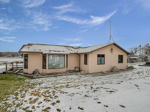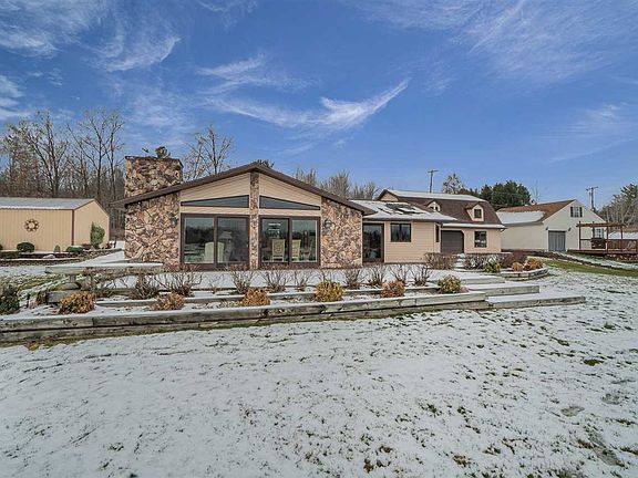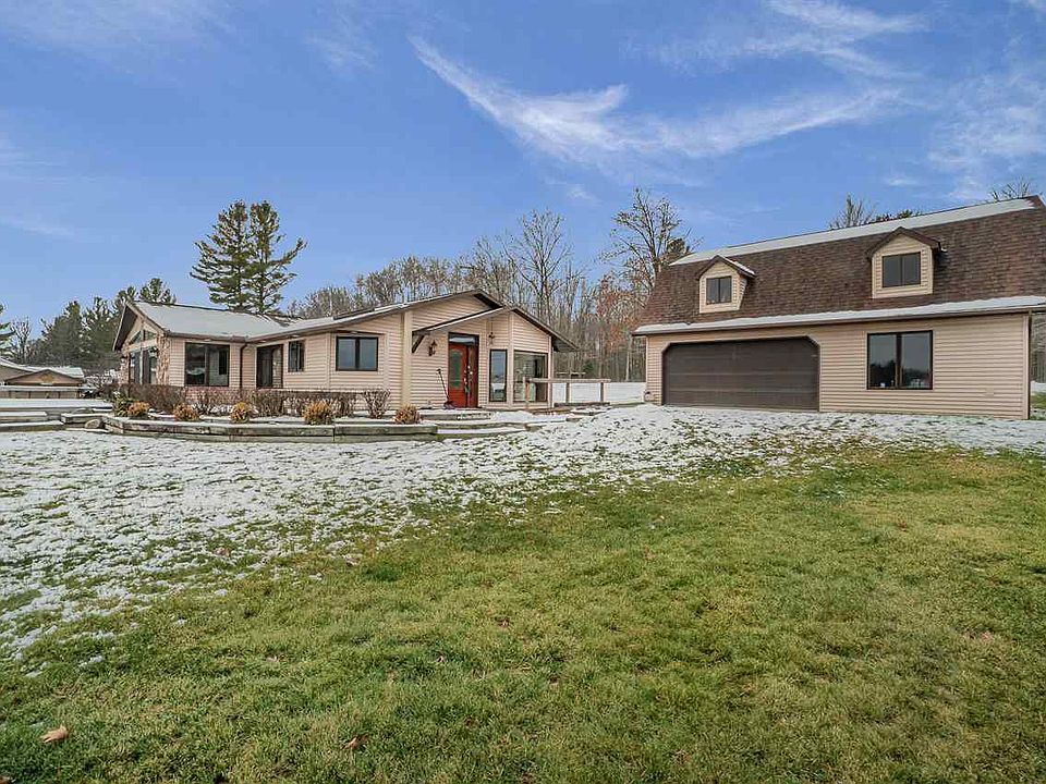 Waterfront w/ large pole barn & garages - both heated 30x40 & 20x40 10+ acres can be divided Two small buildings not included - will be moved