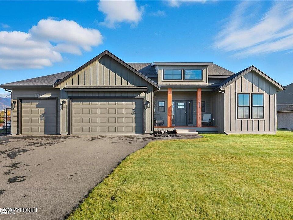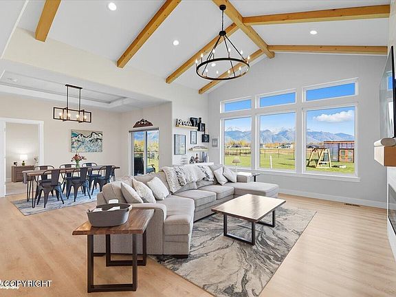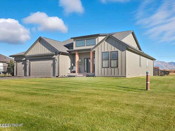 Better than new, lightly lived in ranch home with bigger than life views of the iconic Pioneer Peak. The lot is flat and is fenced in, providing an excellent opportunity to further landscape or develop. The sellers recently installed a greenhouse and a firepit facing Pioneer Peak. Enjoy the luxury of high ceilings, enormous windows, solid surface counters and abundant garage space.Additionally, the sellers added a built-in barbecue grill on the back porch for any grill masters. The sellers also constructed a shed that comes with solar panels already installed and the entire property has a backup generator, offering extra peace of mind. Land behind the property is protected farmland and there are no known plans to develop.