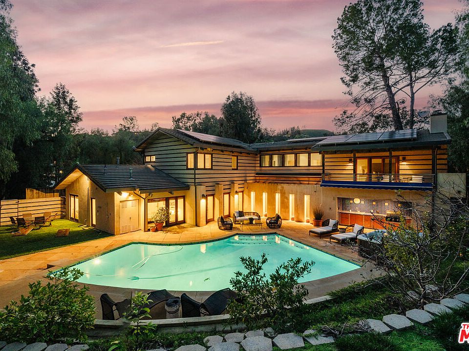 This idyllic equestrian estate offers privacy and tranquility as you enter through the gated drive, an oasis unfolds, tucked back from the street. Situated amidst lush landscaping and mature trees, the main residence welcomes you with multiple courtyards and expansive patio spaces, seamlessly blending indoor and outdoor living. Inside, hardwood floors underfoot and lofty ceilings above echo the simplicity of nature, creating an inviting atmosphere throughout. The first level of this light-filled sanctuary boasts floor-to-ceiling windows, a wood-burning fireplace, and a two-story library with climate-controlled wine storage. A guest suite, complete with sitting room and private entrance, provides comfort and convenience. Large windows with picturesque views of the bucolic yard and stables enhance the modern gourmet kitchen with high-end appliances. The second floor has three bedrooms and two spa-inspired bathrooms to enhance the calming ambiance. The expansive main bedroom boasts a large walk-in closet and a private balcony, offering a serene panorama of the sparkling pool and the outdoor kitchen equipped with a built-in BBQ, the perfect setting for al fresco dining and entertaining. This home has also been upgraded with solar panels and a Tesla battery wall. For horse enthusiasts, this property is a haven. A state-of-the-art barn with multiple stalls, tack room, wash area, workshop, and a private horse arena provides the perfect environment for private training and riding your equine companions, while abundant trails surrounding the estate offer scenic horseback riding and hiking experiences. Even if you don't have horses, the barn presents a versatile opportunity as a guest house, gym, music studio or office space. Indulge in the perfect fusion of upscale living and equestrian bliss at this tranquil Hidden Hills retreat, promising both luxury and a connection to nature.