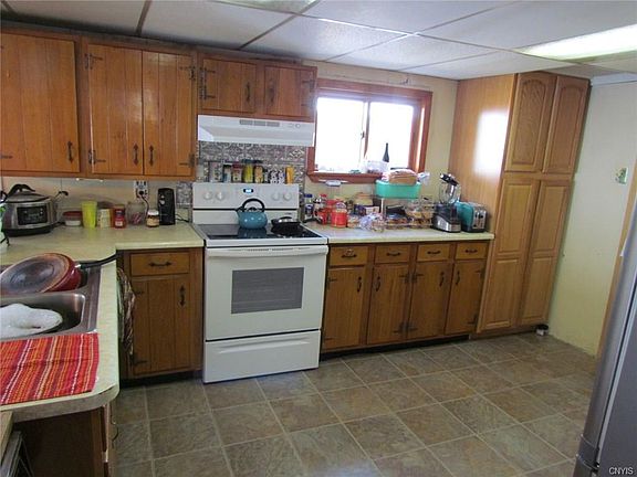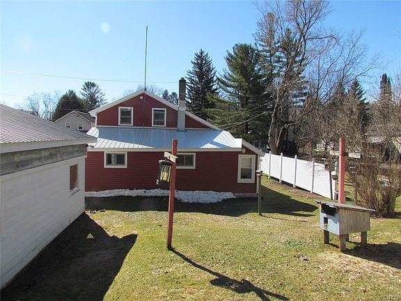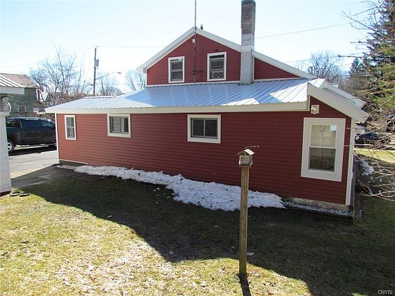 Expensive improvements have been done for you; steel roof, replacement windows, siding, forced air natural gas fired furnace, and electric service. The first level flooring has been updated. A third bedroom could easily be made by converting an office on the first level. There is a front enclosed and heated porch, side heated entry, and two out buildings (10'x14'& 7'x 10') besides oversized 28'x32' garage. The garage offers two 10' high doors, the space heated with wood stove and water service is there. It is great for a workshop. Attached is a 8'x32' covered shed. The basement portion of the home is dry; the stone well grouted. Average heat cost for the past 12 months is $90.84 with electric cost average is $158.85. You can update the baths as you wish and choose floor covering upstairs to your liking. In the living room is a gas fired wood style stove.