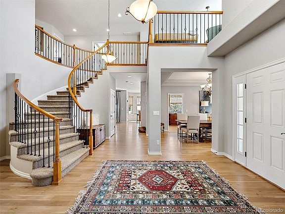 Elegance, sophistication and character abound in this lovely two-story Pradera home with a walk-out basement. Located on a peaceful corner site, you'll be greeted with a sprawling front patio that's perfect for enjoying the beautiful Colorado outdoors with a morning cup of coffee. As you step inside, you'll be welcomed by a grand entry foyer leading to a formal living room with high ceilings and a cozy fireplace. The dining room is spacious and perfect for hosting friends and family. The main level features gleaming hardwood floors. If you work from home or simply enjoy reading in private, the home office with doors is an excellent space to retreat to. The gourmet kitchen is a chef's dream with high-end stainless steel appliances, a walk-in pantry, and a center island that opens to a sunny breakfast nook and a great room. This is sure to be the heart of the home, with patio door that leads to a covered spacious deck overlooking the beautiful treed grounds, making it an ideal spot for entertaining al fresco. The luxurious primary suite is located on the upper level and features a lovely five-piece bath, a sitting area, and a large walk-in closet, providing all the space you need to unwind in luxury. The upper level also boasts three ample secondary bedrooms and a bonus loft area flooded with natural light, perfect for catching up on your favorite show or checking your morning emails. This lovely home is situated in a neighborhood with winding running, walking, and biking trails that will take your breath away. A renowned golf course and country club are just minutes away, offering a variety of amenities to enjoy. The combination of sunsets, nature, and neighborhood make this home a perfect place to call your own!