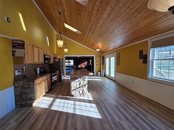 Rustic retreat or place to call home. Charming 2 bedroom, 1 bath home with great room, kitchen with concrete counters & stone on island. Bath also features stacked washer/dryer and tankless water heater. New vinyl plank floors are being installed, (so interior pictures are coming soon). French doors throughout home leads to deck or patio. Large covered front porch, rustic home has had major updates in recent years. 93.5 acres m/l mixture of pasture, woods, walnut trees, hardwoods, spring fed creek runs along front of farm, two ponds, one stocked. Mixture of pasture and woods, good fencing and cross fence as well. 30' x 56' R/V garage and workshop, front and rear overhead doors to house RV or equipment, has concrete floor, electric, water, private well, newer septic, buried propane tank, paved and dirt road frontage, corner lot. 1930's era vintage storm cellar. Whitetail deer and turkey hunting, close to Piney River access, National Forest to enjoy a day trip of hiking.