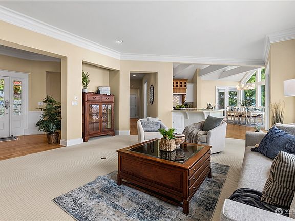 Exquisite bay & coastal mountain views from nearly every room. From the vaulted ceilings in the Great Room & Primary Suite - on the main, to the elegant box beam ceiling in the Family Room, you will love the layout and space. The south facing front porch & 3 car garage are lovely & ample windows overlook the expansive decks, providing the perfect interconnection with the outdoors. The tasteful, low maintenance landscaping blends beautifully with the surrounding community, boasting majestic fir & cedar trees, world-class golf, a marina, tennis courts, spa, and miles of walking trails. The home is live-in ready but some may appreciate the opportunity to update some of the cosmetic design features.