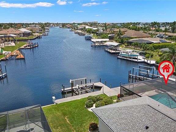 Prime Waterfront Living Opportunity at Cape Coral Yacht Club on Coral Drive! Experience endless water views down the majestic 240ft wide canal, offered at a price that's near lot value. This exceptional location immerses you in the ultimate boater's paradise. Revel in unobstructed water vistas of the sunrise, visible from your bedrooms, living space, and expansive pool deck. Launch into maritime adventures from your backyard dock, outfitted with a captain's walk and a robust 15,000 lb. boat lift. Ideal for hosting gatherings, this property lets you witness spectacular events like fireworks and the Cape Coral Christmas boat parade directly from your dock every December. Retreat to your haven in the recently resurfaced, solar-panel-heated pool, enclosed in a brand-new screen enclosure. This home not only boasts a new roof but also maintained excellent structural integrity through recent storms, demonstrating its resilience. With an appealing floor plan, it serves as your ideal canvas for creating your dream waterfront home. We invite you to witness the breathtaking view in person to truly understand the incredible potential of this property!