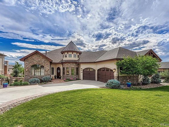 Without a doubt, this is one of the most desirable locations in all of The Timbers neighborhood. This custom ranch home is the epitome of luxury and comfort. Large open great room with heavy beams & the stacked stone fireplace immediately grab your attention. If that isn't enough, step out onto the deck and take in the entire Front Range. The sunsets are AMAZING & ever-changing. The kitchen is a chef's dream with a commercial grade gas range, hood vent, double ovens, warming drawer, double dishwashers, microwave, and a built-in Miele espresso machine. The breakfast nook is something out of a movie. The master suite is the perfect place to call it a day. There is a fireplace and private access door out onto the deck. The master bath has his/her vanities, a large soaking tub, & a walk-in shower. Talk about convenience - the main floor washer and dryer are located in the master closet. To make life even easier, the secondary laundry room is located in the basement with the other bedrooms. Easy one-step entry from the garage into the home with a super convenient drop zone for coats and shoes with a bench. The garage has professional shelving & storage, epoxy floors, 220 plug, & is plumbed for a gas garage heater. Walk downstairs and be ready for fun. There are 3 bedrooms in the basement and each one has a large walk-in closet. Two of them are connected via a J&J bathroom. The guest suite is perfect for guests with an ensuite bath and walk-in closet. The open media/rec room is the ideal place for gatherings and watching the big game. Pool table and Shuffleboard are included. WOW! Check out the custom bar! This will surely draw a crowd at every event you host. If the kids don't want to watch the game, then send them in the movie room. All of the theatre seats, equipment, and speakers are included. Notice the under-deck gutter system that keeps the lower patio dry. This is truly a special home - one you will not want to miss.