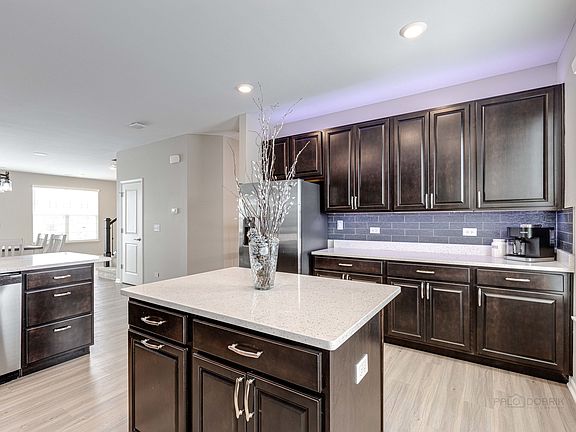 Only 3 years New and ready for you to move in and enjoy! This Chelsea end unit at over 2,200 sft. is the builders' premium and largest model in the subdivision featuring high ceilings builder upgrades plus additional owner upgrades. Enjoy the spacious center island kitchen equipped with mahogany colored 42" cabinetry with crown molding, accent lighting under and above cabinets, custom owner upgraded backsplash, Quarts counters and 2 barstool counter overhangs. Enjoy maintenance free flooring on the main level and the open concept floorpan is ideal for easy living and entertaining. The lower level features a spacious family room, full size laundry room + utility closet. The owner upgraded the unit with additional recessed lighting in the living room and speaker surround system on the main and lower levels. The primary suite features high tray ceiling, walk-in closet with window and primary bath with double vanity and sink, private water closet + oversized glass door and ceramic tile surround shower. The bathroom and stairway light fixtures, all cabinet hardware in kitchen and baths were all upgraded by the owner and the garage has been fully painted + LED light bar installed. The home is equipped with an ADT security system which includes a ring doorbell on the front and back + a ring camera on the side of the house. The walls and ceilings on all 3 levels have been custom painted throughout all 3 bedrooms are wired for tv. Welcome home!