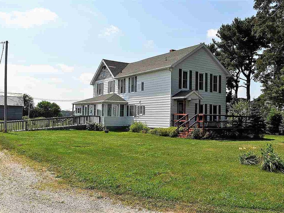 2 Story country home with six bedroom two baths, spacious living room with hardwood floors, 2 staircases, newer high efficient furnace, full basement, 7x20 ft enclosed porch and a 12x23 ft. deck. Also includes a 3-car detached garage, 42x54 newer pole building, drying crib, steel grain bin all located on 20 Acres!!