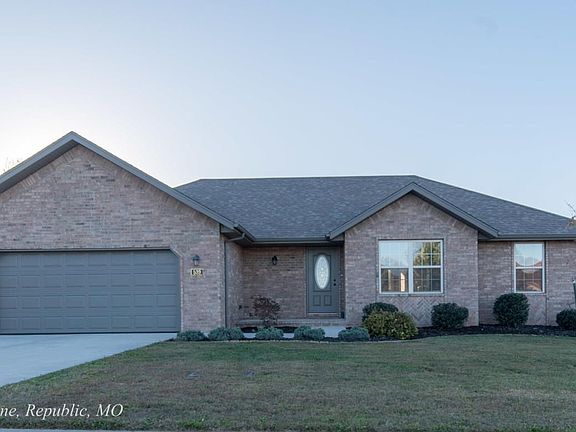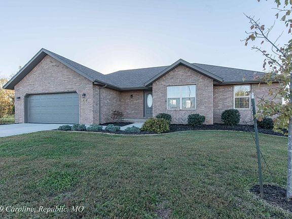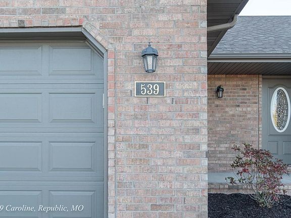 539 S. Caroline, Republic, MO 65738. All brick, split bedroom plan, deck, extra large master bedroom with a walk-in closet and walk-in shower, tile floors, wood trim, raised ceilings, ceiling fans, attic fan, smooth top range, microwave, upgraded dishwasher, pantry cabinet in kitchen, oversize 2 car garage. All brick and insulated interior walls mean a quieter home and lower utility bills. Home has upgraded cabinets and under cabinet lighting.