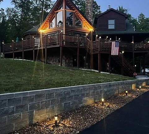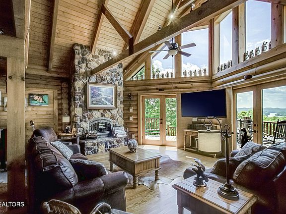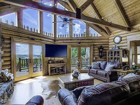 SPECTACULAR VIEWS with this luxurious log cabin boasts a casual elegance that is welcoming and inviting, sitting on 14.11 acres of land on 3 lots. Previous listing had only 7 acres with it. Located in Grande Vista Bay on Watts Bar Lake Featuring a stunning open great room with a soaring cathedral ceiling and a wall of windows that offer breathtaking views of the lake and mountains. This home is a true retreat from the hustle and bustle of everyday life. With hardwood flooring and tongue and groove ceilings throughout, the cabin exudes a warm and inviting atmosphere. The formal dining room glows with plenty of natural light from the bay windows vaulted ceiling wonderful view of the lake. The eat-in kitchen makes cooking a pleasure with stainless appliances, custom cabinetry, 3 lazy Susan's, smooth cooktop with Microwave. Under and Above counter lighting with ceiling track lighting. The main level has two bedrooms one with lake views and the other with the woods. These provide plenty of space for family and guest with the full bath. Oversized laundry could also include a workshop/craft/pantry area. Walk up the stairs to the magnificent open loft with those fabulous views. Sit and read or work in your office. Time to head to bed in the primary bedroom and well-appointed bath., with corner Jacuzzi, walk in seated shower and double sinks. The lower level says it's time to entertain guests in the large rec room bar area with a family/game room, Full Bath with walk in shower on this level too with 2 car garage. Relax on the covered wrap around deck sitting on the swings while you take in the sunset. There is even an outdoor shower for you to use after playing in the wonderful acres. This home makes for a perfect quiet evening. Whether you're looking for a primary home or your personal seasonal getaway, this cabin in a gated waterfront community is sure to impress.