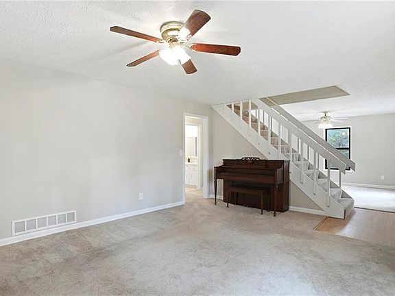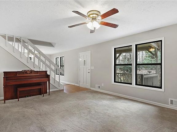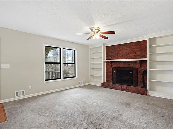 2 story traditional home on beautiful 1 acre lot in Woodstock*front porch*neutral carpet*open/bright floor plan*new paint*thermal windows*built ins*brick fire place in den*corian counters*white appliances*extended white cabinetry*gas stove*12 inch ceramic tile*large bedrooms/closets*master on main option*bathrooms with neutral vanities*vinyl*new toilets*large deck with views of private lot*driveway with ample parking space leads to side entry garage w/ potential 2 car tandem/extra space for golf cart/small vehicle