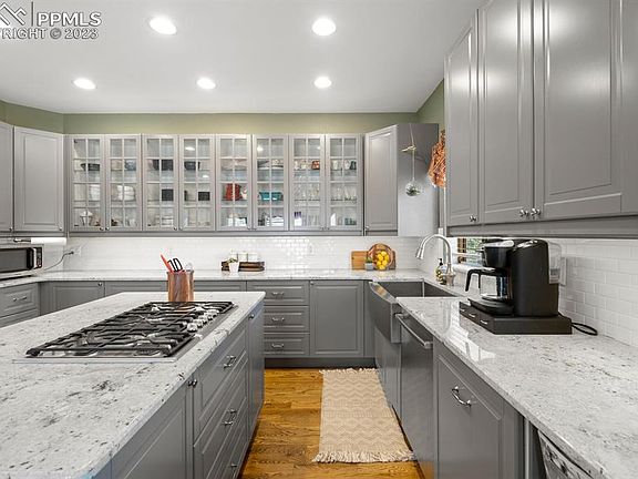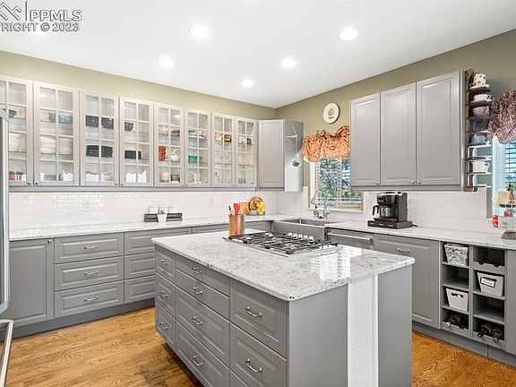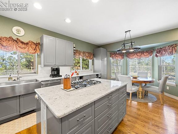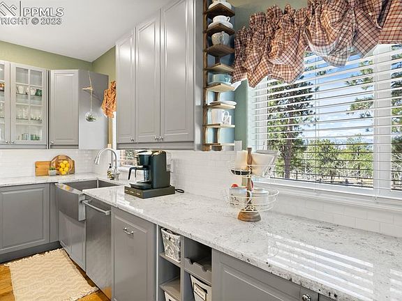 This stunning equestrian property is located in the heart of Black Forest & is situated on a spacious 5 acre lot that backs to miles of horse riding/hiking/biking trails. This beautiful home boasts unparalleled privacy & serenity, while offering all the modern conveniences & upgrades you could ask for. Step inside & you'll find yourself immediately enchanted by the beautiful hardwood flooring & wood burning fireplace. The kitchen has been fully remodeled & is now a chef's dream, complete with high-end stainless steel appliances, quartz countertops, all new custom cabinetry w/ custom pull outs & drawls, new sink, faucet, lights, tile backsplash & custom window with picturesque views of Pikes Peak! The master bathroom has also been completely redone w/ a luxurious spa-like feel that will leave you feeling pampered & refreshed to include his & hers closets, large stand alone soaking tub, expanded shower w/ custom tile & new vanities. The main level also offers a second bedroom & updated full bathroom, a formal dining area w/ beamed ceilings & laundry room w/ sink. The fully finished wallk-out basement boast 3 additional bedrooms, a full bathroom & 1/2 bathroom, a new pellet stove, wet bar w/ dishwasher & fridge, a tiered theater rm w/ surround sound, new carpet & stacked stone accents. The outdoor space is equally impressive, w/ a covered deck that's perfect for entertaining or simply relaxing & taking in the Ponderosa Pines. You'll love cooking up a storm in the outdoor kitchen, while the fireplace & hot tub will keep you warm and cozy on even the chilliest of evenings. The property also features a loafing shed & horse barn w/ extra garage space, making it the perfect home for equestrian enthusiasts. Other features of this magnificent home include new interior & exterior paint, & a new roof & gutters. Located at the end of a cul-de-sac, just minutes from town, this home is the perfect combination of luxury, comfort, & convenience. Truly a must see!