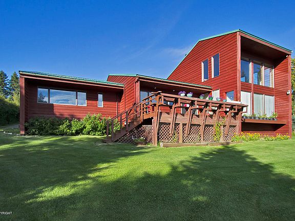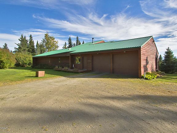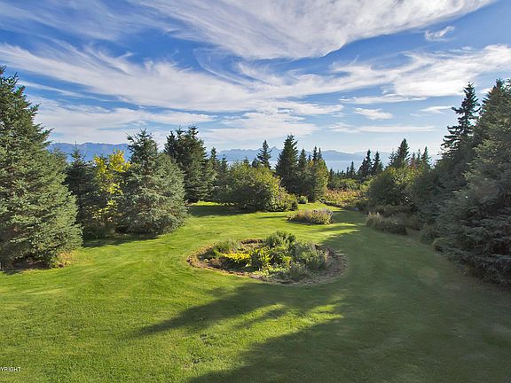 Ultimate privacy on this 4.77-acre parcel with beautiful landscaping and views of Kachemak Bay! This cedar-sided home lives like a ranch with one bedroom on the main floor and a large sleeping loft or family room upstairs. An Island fireplace with custom tile anchors the house between the living room and dining/kitchen. The oversized 1,100+ sq. ft. garage has a workshop space and half bath.