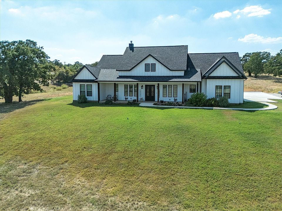 Custom Modern Farmhouse nestled on nearly 4 secluded acres, complete with a shop. The inviting front porch features cedar accents and ample space for rocking chairs, allowing you to enjoy the rolling countryside and picturesque sunsets. As you enter, the spacious family room with vaulted ceilings, custom cabinetry, and walls of windows offers incredible views of the surrounding country. The open-concept kitchen boasts an oversized island, stainless steel appliances, and an eat-in area perfect for entertaining. The primary bedroom features floor-to-ceiling windows and a stunning master bath with a standalone tub, complemented by an impressive master closet. Located in the Weatherford ISD, this property also includes an unfinished bonus room above the garage. Additionally, there’s $10,000 worth of pipe on the ground for the buyer to build a fence.