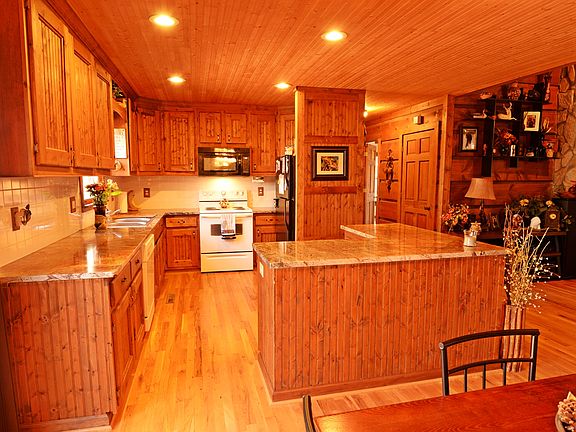 Fabulous 3 bedroom, 2 bath cedar sided home in private setting at end of cul-de-sac. Additional 750 sf plus for future expansion in the basement. Kitchen has new and unique African Marble countertops cabinets have been stained black with a rubbed offf rustic look and new aged metal backsplashes. Great room with stone propane log fireplace and beautiful log style walls, master bath has been completely remodeled with a walk in shower with built in seat and shampoo nooks rain shower head with seamless glass door, master has two closets, updated fixtures through most of the home, hall bath has new tile floor, Custom barn doors through out the entire house, back deck has a multi level and large rocking chair front porchwith,newly landscaped back yard.