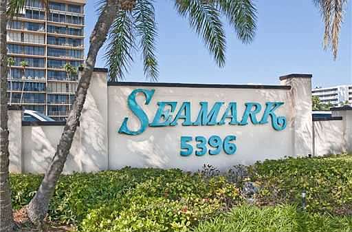 A water view for miles from every room! Sitting almost 100 feet off of the ground with a panoramic view extending north on St. Pete Beach over the top of the Tradewinds Resort east to Tropicana Field then south to Gulfport. This corner condo has two large tiled balconies to enjoy the scenery both day and night. Professionally updated in 2012 with designer features including: (a) showcase kitchen with wood cabinets featuring pull-out shelves glass fronts and wine storage (b) granite countertops (c) built-in desk with beach view (d) upgraded bathrooms with granite countertops (e) tile flooring in kitchen (f) new carpet in bedrooms (g) electric hurricane shutters on all three sets of sliding glass doors (h) walk-in closets in both bedrooms and (i) other design features. The Seamark building recently had new luxury carpet installed throughout the halls newly trimmed doors fresh paint throughout and an updated lobby. Parking lot was resurfaced new impact resistant windows on the entire building and internal utilities have been updated. All of this updating and the maintenance fees are still low! Come see an outstanding corner condo in a highly desirable building offered at a great value!