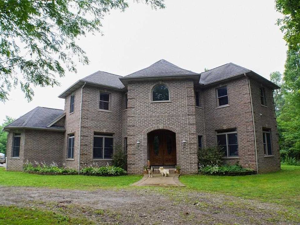 Majestic home, dream setting. This huge home greets you with beautiful brick work, oversized double front doors leading to the amazing foyer featuring cathedral ceilings & curved staircase. The main floor features a giant master suite w/walk-in closet, dual sinks, & doors leading to the deck and pool. The open living room has 2 sets of doors leading to the deck. The oversized kitchen has tons of cabinets & storage, island counter with eating bar, and features an oversized breakfast nook. The formal dining room has a stepped ceiling, arched doorway, lots of windows and is accessible from the kitchen & living room. Main floor laundry w/half bath is accessible from pool area. The second floor has a balcony overlooking the living room & 3 large bedrooms w/ a full bathroom. The basement has 9' ceilings & windows. Some walls framed in & plumbed for a full bathroom - could easily be finished for additional bedrooms & living space. All this on 40 acres w/tillable land, woods, & a creek.