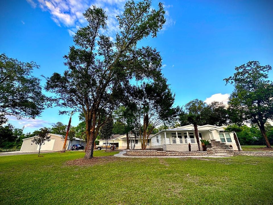 This is a special property! Gorgeous 5 acre setting provides so many options! Property consists of a custom 2010 triple-wide with numerous upgrades, 3 bedrooms, 3 baths, large closets, dedicated office and den areas, fabulous kitchen with hidden pantry, large great room and dining area. Several additions, incl a 2 car garage, huge rec room, a 2nd flex space, front and side porches, a screened back living room, plus newly constructed deck. A 4,000 sq ft shop, 40ft x 80ft, on an 8 inch slab has automotive lift, automatic garage door + many other upgrades giving you so many options! 2nd 16ft x 26ft building provides addl flex space. Property has fenced area for animals on NW corner + room for addl pastures. 5 acres feature beautiful mature landscaping, 4-slat fence along tree lined gravel driveway, and an automatic gate opener.