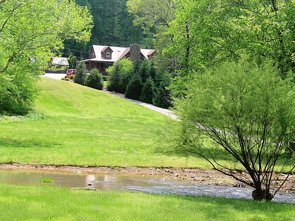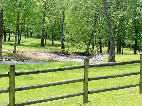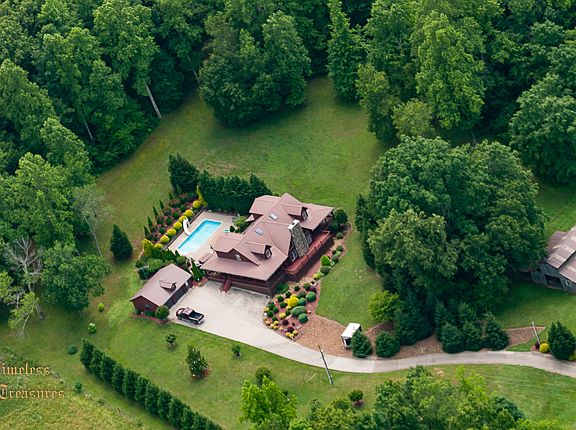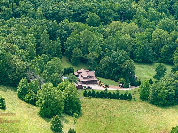 BIG RICHLAND CREEK flows through this PRIVATE COUNTRY ESTATE with an executive custom LOG home about an hour from NASHVILLE, 4 private b'rms & baths, HICKORY floors, STONE f/p w/insert, inground pool, wrap porch, lush landscaping, 4 stall tack barn