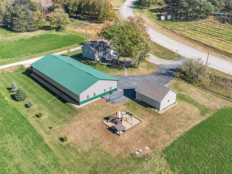 5.41 Acres Pristine Country Home with Massive Shed/Workshop endless opportunities. This beautifully maintained four-bedroom, three-bath home has main-floor living, vaulted great room with large windows filling the space with natural light. The open-concept kitchen and dining area feature Corian countertops, stainless steel appliances, LVP flooring, and quality woodwork throughout this custom-crafted home. Step outside the patio door to a large maintenance-free deck overlooking a beautifully landscaped, meticulously manicured country oasis—move in and simply enjoy! Outdoor living includes a stamped concrete patio, firepit, covered front porch, and a Rainbow playset area with covered sandbox—a perfect bonus! Built with an ICF foundation and in-floor heat (including the lower level), plus a new water heater. Approximately 3.5 acres are currently used for hay ground—ideal for horses or hobby farming. Exceptional storage with a 30x24 detached garage (10-foot ceilings) and a massive 48x104 pole shed with full concrete floor, in-floor heat in the 40x48 section, gas boiler and a half bath in the shop. Pride of ownership shines throughout! Conveniently located just 15 minutes from Rochester, minutes from Highway 52 and the new school. Don’t miss this rare country find—schedule your showing today!
