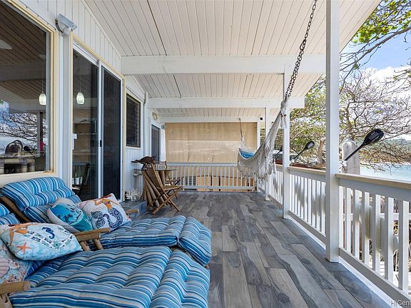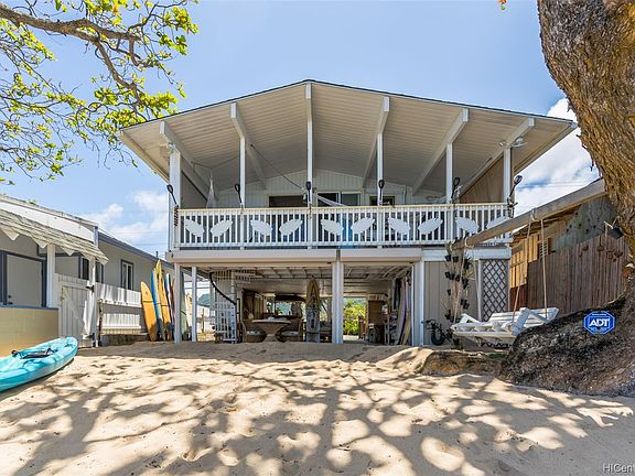 A true Beach House, so cute, with great trade winds blowing through to your back yard, the sandy beach! Over $80,000 in upgrades, including a new roof/gutters in 2018, an extensive security system, and 7 aluminum remote controlled "doors" downstairs for privacy, security and flood protection. So many possibilities remain, but currently the bottom floor is used as additional living space (previously a carport). The lanai that runs the length of the property, providing you a spectacular unobstructed ocean views. Lots of clever storage space added, you will feel the pride of ownership as you tour the home. Currently owner occupied, but this would easily be a fabulous second home. Click on the "movie reel" icon to view the video.