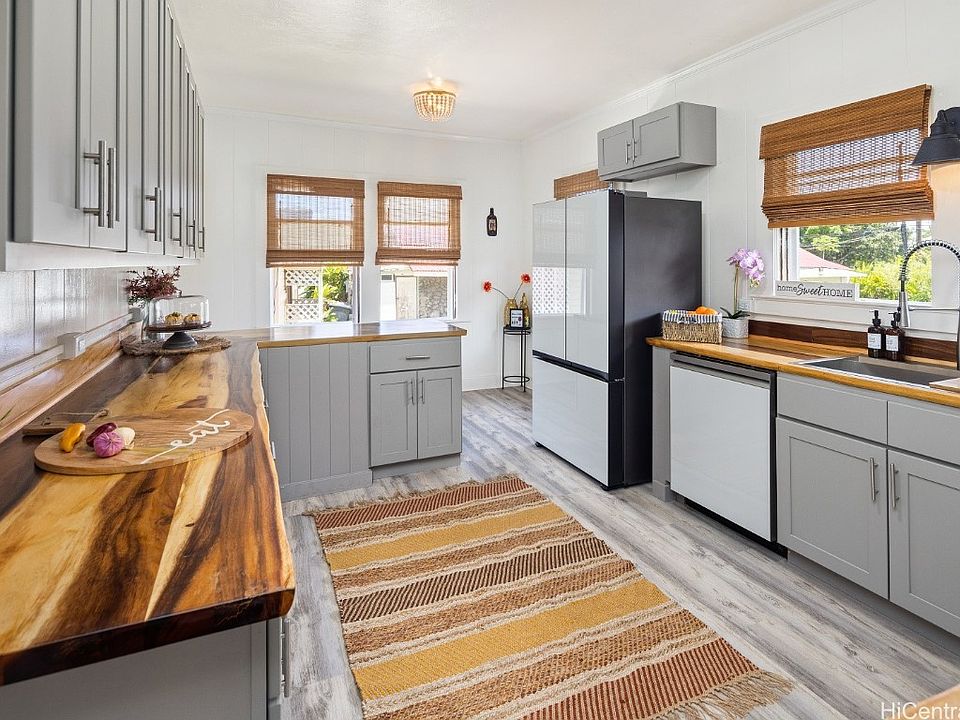 Remodeled and Ready to move in, this vintage 1950s post-&-pier home in Hauula is not one you'll want to miss. Freshly painted inside and out, with new copper plumbing, new water heater, upgraded electrical, all new light fixtures, renovated kitchen with custom Monkeypod wood counters and redone bathroom. Restored hardwood floors in main livingroom, and luxury vinyl planks throughout the remaining space. All-new appliances: Samsung Washer and Dryer, Samsung Bespoke Dishwasher with matching Bespoke Convection-Microwave Hood and Bespoke Refrigerator with water-line, beverage station and the ability to update their faceplate colors/style, New Whirlpool Oven/Range. Fabulous Original Double-Hung French windows, High Ceilings, and Lots of cute old charm balanced with modern luxuries. Spacious Entry Porch is perfect for sitting on and overlooking your yard, just waiting for your personal touches, and back-dropped by beautiful Mountain Views. Close to schools, beaches, hiking, parks, groceries and more! Back on Market - Buyer's loss is your gain.