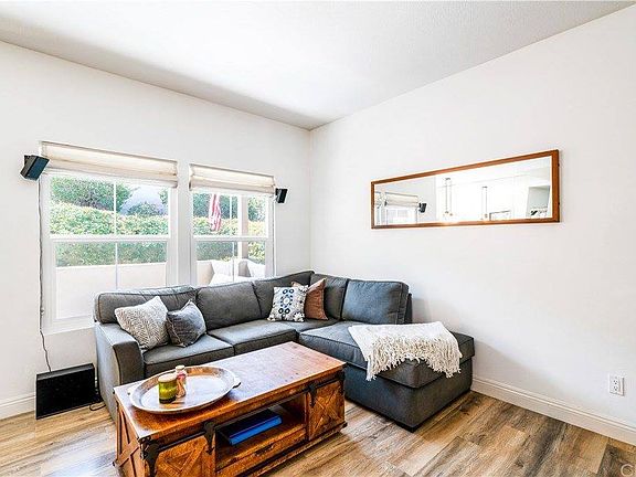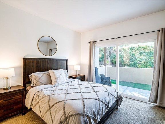 This modern condo in Rancho Santa Margarita is close to amazing schools, parks, hiking/biking trails, and lots of nearby shops and restaurants; plus, it has a pool and lake access for fishing. The home itself features clean white lines, lots of natural light, and a luxury master suite. The open floor plan adjoins the living room with the kitchen and dining area, for ease and flow. The beautiful laminate floors warm the space, while the large and brand-new double pane windows throughout to bring in the surrounding green landscape from outside. The kitchen features state-of-the-art stainless-steel appliances, white cabinetry and recessed lighting. Contemporary light fixtures over the dining table, while the living roomâEUR(tm)s sleek fireplace with wooden mantle add to the tastefully chic vibe. The master bedroom is spacious and inviting with its earth tone carpet and sliding glass doors to a private enclosed porch. A huge walk-in shower with dual shower heads including a rain shower head and white subway tiles will get you feeling clean and luxurious! Double vanity sinks and the black geometric tile floors really pop against the warm wooden cabinets. The second bedroom has a nice window, the second bathroom has a bathtub, and the hallways are lined with built-in storage. There is another covered porch off the living room, where you might enjoy your morning coffee or sunset cocktail overlooking the lavish green hillsides of lovely Rancho Santa Margarita.