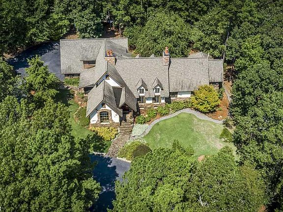 At Tanglewood Estate, you are met by English gardens & tranquil waterfalls. The beloved home of an Architectural Interior Designer, this manor has an open plan with cathedral ceilings, 175-year-old reclaimed beams, hardwood & limestone flooring, dark-stained Library, Viking appliances, a vast pantry, stain-glass accents, actual pub downstairs: includes a reinforced storm room/wine cellar. Quaint potting shed with dog kennel.The hanger 65 X 65 with office & living qtrs 1,295 sq ft. Boat ramp minutes away.