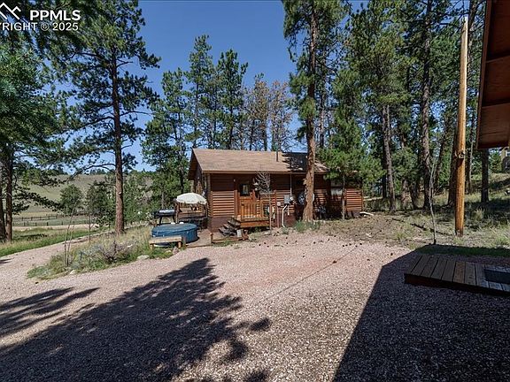 Experience Colorado living at its finest in Florissant. This home offers a rare opportunity to own a slice of Colorado's natural beauty. This charming 2 -bedroom, 1 bathroom, redwood log cabin is set on an expansive 2.5 acres of wooded land and is the perfect escape from the ordinary. Surrounded by beautiful tree lines and located within a quiet HOA community, this property offers privacy, peace, and a true connection to nature. The interior features a classic log cabin architecture with warm wood accents and a welcoming ambiance. This property offers an extraordinary opportunity with five additional lots included. The possibilities are endless for this property. The cabin itself exudes rustic charm, with warm wood finishes, an inviting open concept living area, wood floors and coxy bedrooms that provide the perfect retreat after a day of outdoor adventures. There is a large, detached garage and workshop space. The property is located near the Florissant Fossil Beds National Monument, offering easy access to one of Colorado's most unique natural attractions. Enjoy quiet mornings or evenings on the deck, taking in the tranquil surroundings of towering trees and lush greenery. This home is a rare find and a peaceful haven surrounded by nature, with ample room to grow and explore. Don't miss your chance to own a piece of Colorado's mountain paradise.