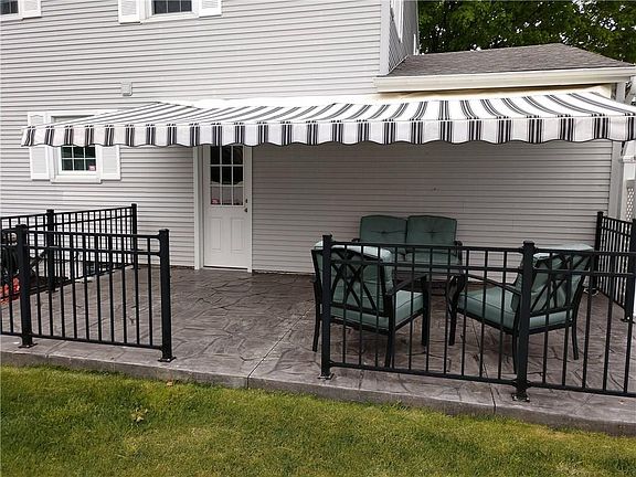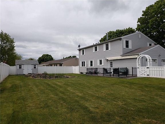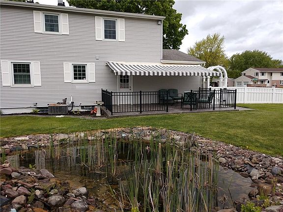 Hurry before this rare 4 bedroom 2 1/2 bath colonial is gone. Beautifully kept home. Hardwoods that have never been exposed under all carpets. All bedrooms great size with double closets in each. Master bedroom has a master bath with linen closet and his and hers double closets. Beautiful stamped concrete walkway and patio. Patio has an electric Awning with LED Lights to enjoy summer days overlooking the pond with waterfall and recently customized vinyl fenced yard. All windows including block windows in basement recently replaced. Custom vinyl sided shed. Flower beds recently surrounded by concrete Curbing. Close to so many amenities(Town Park, Recreation Center, Library, Shopping and Dining)