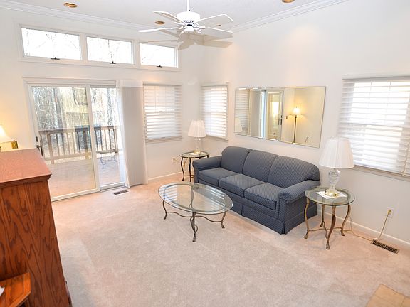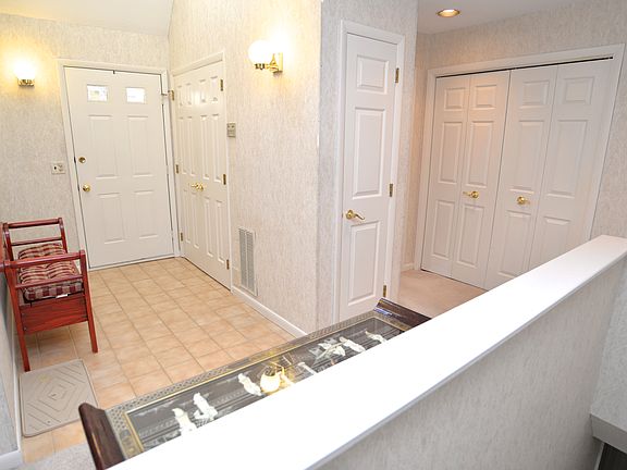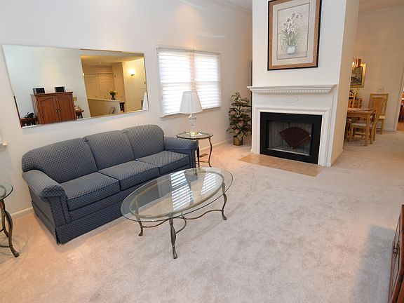 Spacious, light filled Ranch in desirable Sterling Woods. The open-plan design includes a tiled foyer w/skylight & wall cutout to dining room. A partial wall, featuring a fireplace with tile hearth & custom mantel, divides the living & dining rooms. Sliders to deck overlooking yard & wooded area. Bright & cheery eat in kitchen w/stainless steel appliances, tile floor & backsplash. Master bedroom has full bath w/double sinks, whirlpool tub & separate stall shower, walk-in closet, & French door to deck. 2nd bedroom, laundry, & full bath complete the main flr. The finished, walkout lower level includes: A large family room w/sliders to the patio, den, ample storage, & workshop. Amenities incl pool, clubhouse w/exercise room, & tennis courts.