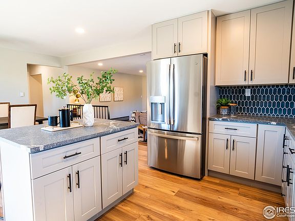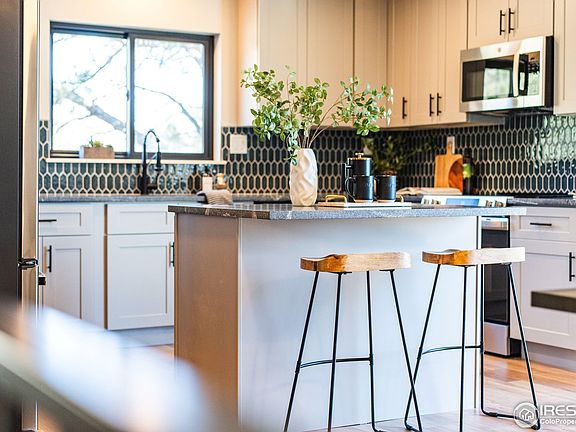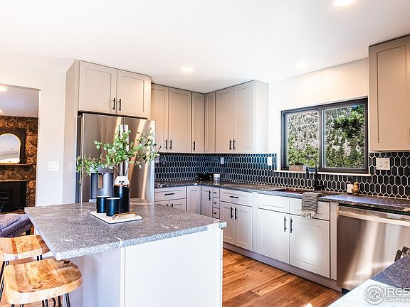 This professionally remodeled home features contemporary designer upgrades throughout, creating a stylish yet inviting atmosphere. The kitchen has brand-new stainless steel appliances, a custom tile backsplash, quartz countertops, and an island with a breakfast bar-perfect for casual dining or entertaining.The primary bedroom is a serene retreat, featuring private patio access and a luxurious 3/4 bathroom with custom tilework and upscale finishes. The cozy living room, warmed by a wood-burning stove, opens to a covered patio and the expansive backyard, perfect for year-round enjoyment. A private study off the foyer adds versatility for a home office or quiet sanctuary.The spacious family room offers endless possibilities for relaxation and entertainment, complete with a working sauna for your personal spa experience. Just off the kitchen, a large deck provides the ideal vantage point to take in breathtaking mountain views.As you arrive, dramatic rock outcroppings and a circular driveway make a striking first impression. The oversized detached garage offers ample storage and parking, while an adjacent area provides room for RVs or extra vehicles.Nestled on nearly 2 gently sloping acres, this property offers plenty of usable space for outdoor activities and serene enjoyment. There is concrete pad ready for a hot tub next to the deck with power installed. The Voluntary HOA allows you to enjoy the community park areas on the river that has natural pools to swim in and Crescent Lake. With easy access to Estes Park or Lyons via Highway 36 and a short walk to the beloved Colorado Cherry Company for their famous pastries, this home combines convenience, comfort, and a touch of local charm.