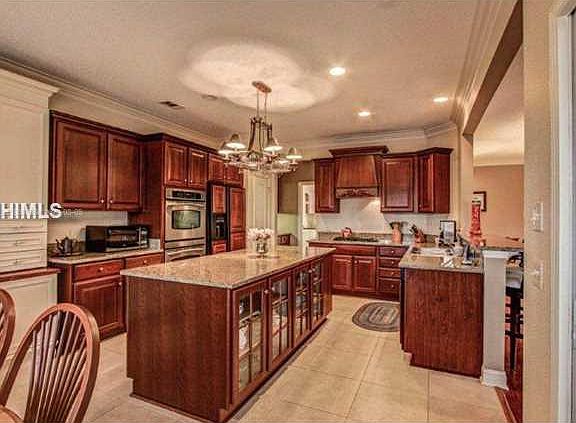 Beautifully appointed custom Wisteria model w/gorgeous view of woods and golf. Large vinyl / screened porch w/porcelain tile floors;3 ceiling fans; and gas bib for grill. Handsome wood floors in LR and DR. Fireplace wall w/built-ins; plantation shutters and double crown molding. Terrific kitchen has cherry cabinets w/pull outs; custom hutch and custom window seat; double oven; gas cook top; extended center island w/microwave at end and granite counters.