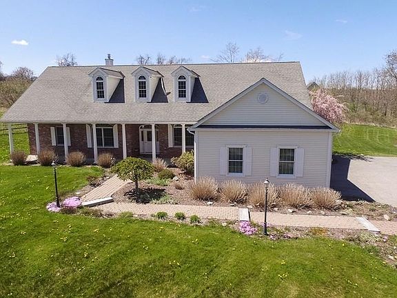 This sprawling custom built ranch offers an open floor plan with 13 ft cathedral ceiling starting in the kitchen with a substantial amount of gorgeous wood cabinetry, granite counter tops & large island, newer slate finish appliances, a under cabinet vacuum pan and dining nook; the dining room provides significant space for the largest of dinner parties open to the living room with build in custom shelving, propane fireplace & beautiful view of rear of the residence. The study/library with dry bar & ceiling high book shelves is the perfect place to end your day. On the east side of the home you'll find the grand master suite has everything you could ask for; propane fireplace, walk in closet, laundry chute are joined by the master bath with double sink, spa tub, vanity & large walk in shower provides. Plus 2.58 acres, 25x13 2 car garage w/13 ft ceilings, A/C, hardwood floors & 2500 sq ft basement. 1 YEAR HOME WARRANTY & mounted TV included.