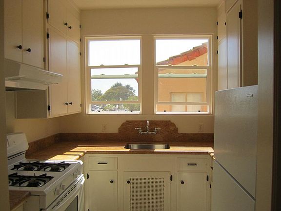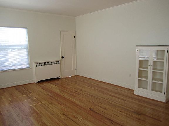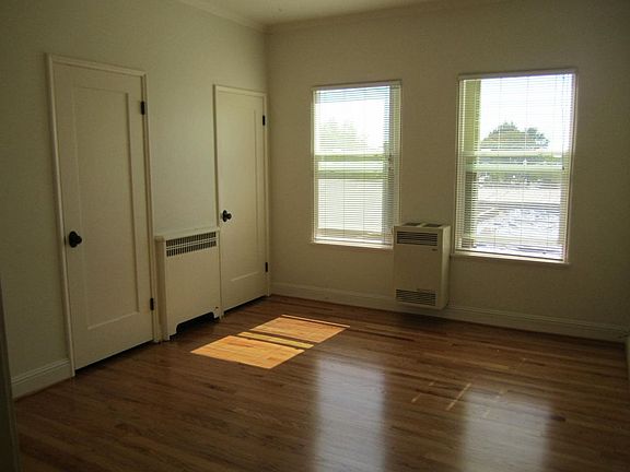 Upstairs, sunny unit corner unit. Carpet throughout. High ceilings, arched doorways. Closet off living room could be a very small office. Bedroom has two closets. Kitchen has been up-dated with granite counters. Bath has tile walk in shower and separate tub. Modern heater in living room and bedroom are functional; vintage heaters are not functional and just for ambiance. Private garage space.