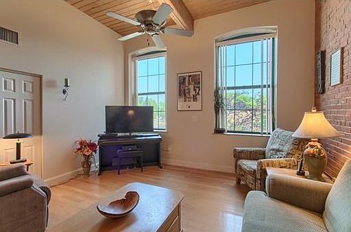 Exposed brick and lofted wood ceilings create a true WOW factor in this 2 bed 1 bath loft condo in the very well maintained and sought after Wellington condo complex! Plenty of natural light with oversized windows! Enjoy single level living in this 3rd floor unit with elevator access. Upgraded ceiling fans included in living room and both bedrooms. Beautiful wood floors throughout both the living room and kitchen! Brand new electrical panel just installed! Move right in and start enjoying the benefits of maintenance free living! Easy highway access and walking distance to Doyle Field with walking paths, playground, tennis courts and more! Note: Only one pet allowed with breed and size restrictions.
