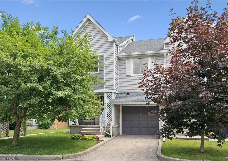 This “Tall Pines” multi-level townhome in Pioneer Park/Doon offers 3 bedrooms, 2 bathrooms, 2 parking spaces (garage and driveway), and updates throughout. Step inside the front door to a welcoming, spacious foyer. There is new flooring from the front door, up the stairs to the open concept living room and up the stairs to the bedrooms. The unit has been freshly painted throughout. The open concept living/dining/kitchen is bright with lots of natural light. Beautiful built-in custom storage in the dining room. Walkout from the living room to a deck that overlooks the yard. Four stainless steel appliances included in the kitchen as well as recent updates: new counters and backsplash and freshly painted white cabinetry. The lower cabinets in the kitchen have pull-out drawers and shelves for maximized storage. The primary bedroom with large walk-in closet offers extra privacy on the upper level. The main bath has been updated with shower, new vanity, custom built-in cabinetry for linens and toiletries. The bright walk-out basement is mostly finished and has a custom built-in entertainment unit. Walkout to a newer deck and fenced yard. Updated furnace and AC in 2022. Reasonable monthly condo fee includes water, roof which has been updated recently, and windows, along with landscaping and snow removal. Amazing location - near Conestoga College, quick access to 401, great amenities close-by include shopping, restaurants, library, park, playground, walking/biking trails, transit. Lots to love about this move-in ready unit – book your showing today!!