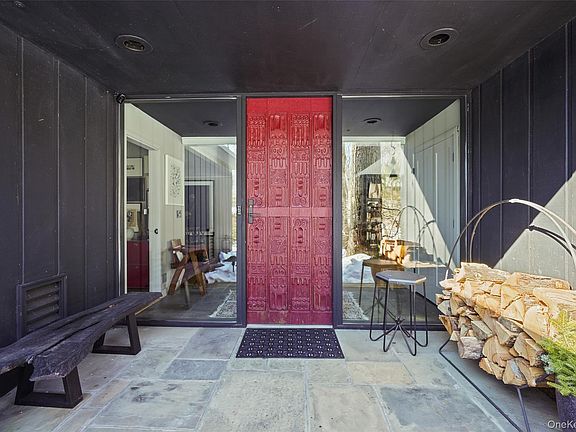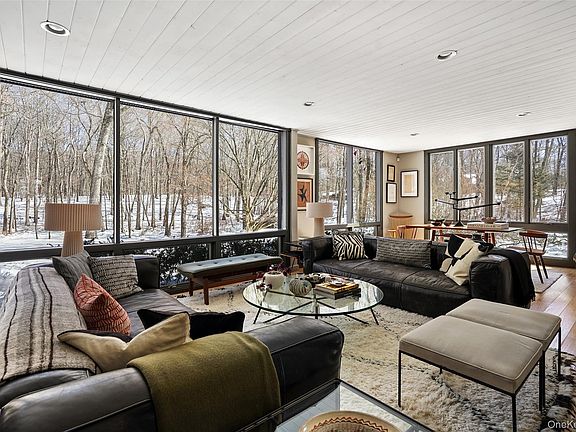Brookside. The perfect, private refuge. Long drive through woodlands to breathtaking grounds. Exceptional Modern surrounded by flowering trees and perennials, rolling lawns and dramatic rock outcroppings. Open and modern floorplan with a loft-like feel. Sun-filled spaces with high ceilings, walls of glass and skylights. Clean, modern aesthetic perfect for showcasing art and furnishings. Dramatic Foyer with floor-to-ceiling fireplace. Open Living Room and Dining Area. Chef’s Kitchen with custom cabinets, honed granite counters, two working islands and a breakfast area. Comfortable Den with skylight and window wall. Private Primary Suite with skylit Bath. Second Bedroom with ensuite Bath. Beautifully finished lower level with Family Room/Artist Studio/potential Bedroom. Private Swimming Pool overlooking a babbling brook. Peaceful setting yet easy drive to Scotts Corners, New Canaan, Metro-North trains and the Merritt Parkway. An incredible offering!
