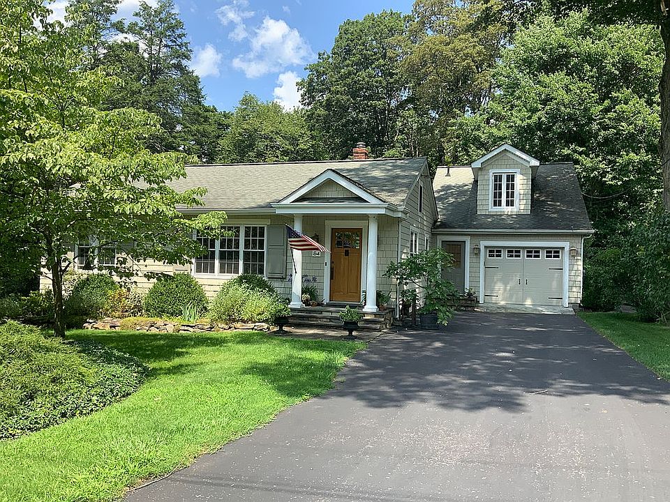 Sided with cedar shakes, home is a cottage style with a two car garage. Includes a large screened in porch in back of the house and a finished basement. There are two living areas separated by a small library. There is a wood stove in the rear living room overlooking a view of a nature preserve.