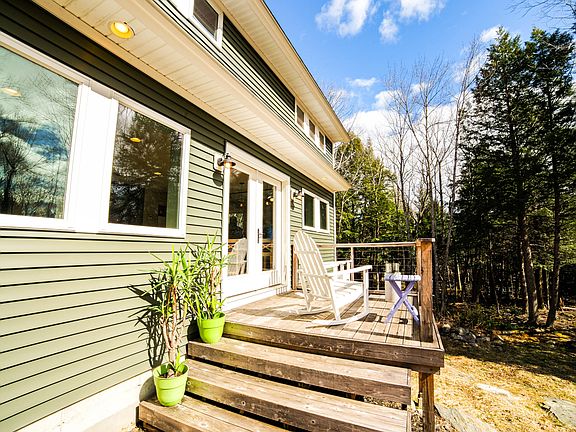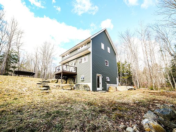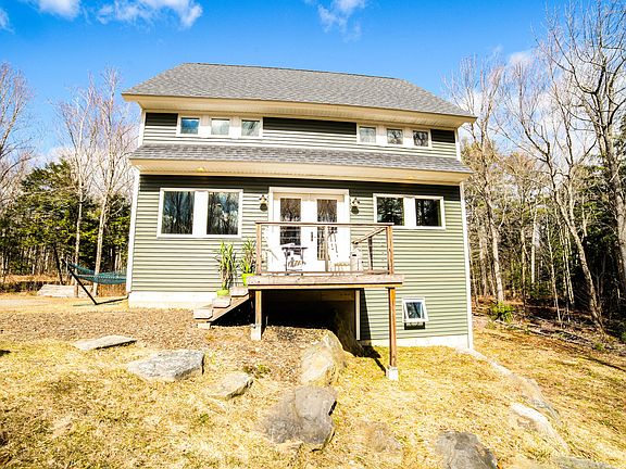 Welcome to this contemporary home nestled on 5 acres of picturesque landscape, featuring a tranquil stream meandering through the property. Built in 2016, this residence showcases thoughtful construction features such as triple pane windows, double thick walls, and rockwool insulation throughout ensuring comfort and energy efficiency year-round. As you step inside, you're greeted by a mud room with two closets and a half bathroom. The first floor has an open and modern layout, seamlessly connecting the living, dining, and kitchen areas. Off the kitchen you'll find a spacious walk-in pantry, perfect for storage and organization. Enjoy gatherings or quiet moments on the deck off the dining area, where you can soak in the serene views of the expansive yard and the gentle flow of the stream. The second floor has a laundry area for added convenience, a primary bedroom, a guest bedroom, and a full bath adorned with a stand-up shower and an oversized tub. The full basement, currently unfinished, presents potential with two windows and a full-size door, offering ample natural light and the possibility of converting it into a daylight basement bonus space to suit your needs. Outside, the landscaping is enhanced by gorgeous stone accents, adding to the aesthetic appeal of the property. Additional features include a whole house air exchanger system for fresh indoor air quality and two heat pumps for efficient heating and cooling, ensuring comfort throughout the seasons. Conveniently located just 0.7 miles from the public boat landing at Washington Pond, this home offers easy access to recreational activities and amenities while providing a peaceful retreat in a picturesque setting. Don't miss the opportunity to make this exceptional property your own!
