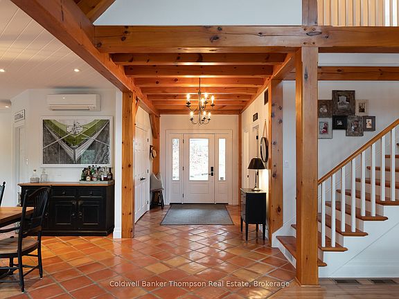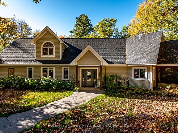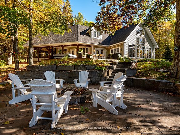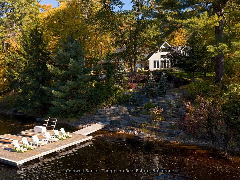 Welcome to this exquisite post & beam home on beautiful Lake Vernon, part of Huntsville's desirable four-lake chain. With over 200 feet of frontage and coveted southwest exposure, this property enjoys long afternoon light and calm waters ideal for swimming and boating. Granite hardscaping with impressive stone steps leads gracefully to the shoreline, offering a perfect balance of beauty and function. Built by the prestigious South Mary Lake Contracting, the home showcases fine craftsmanship and thoughtful design throughout. The main floor immediately captivates with a spacious foyer that opens to a breathtaking wall of windows framing the lake. The open-concept kitchen, dining & living area is warm and inviting, featuring terracotta-inspired tile, wood flooring & radiant in-floor heat throughout this floor. The renovated kitchen blends modern efficiency with timeless charm, while the living room's floor-to-ceiling stone wood-burning fireplace anchors the space in rustic elegance. Just off the kitchen, a screened Muskoka room invites quiet mornings and relaxed evenings outdoors.The main floor primary suite offers comfort and privacy with a walk-in closet & a 5-piece ensuite featuring a soaker tub, double vanity & glass shower. Upstairs, two generous bedrooms share a 4-piece bath; one bedroom includes a cozy private sitting area perfect for guests or enjoying time on your own. A detached double garage provides ample parking and storage, with a 2-bedroom, 1-bath suite above, ideal for extended family, guests, or added flexibility. A Tesla Powerwall supports the home's efficiency, reflecting the care and attention invested in every detail. Set beside a 4.5 acre municipally owned open space parcel, the setting feels relaxed and natural, with the added benefit of extra breathing room. This Lake Vernon retreat brings together craftsmanship & comfort in a truly special way.