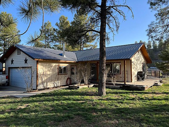 3 bed 2 bath single story home located at the end of a quiet cul-de-sac. Greeted by the smell of fresh lilacs when you arrive home, this is a must see! The wraparound porch is perfect for drinking coffee in the mornings or for viewing the beautiful Pagosa sunsets. Tall ponderosa pines in the yard keep the house cool in the summer. Outdoor fire pit is perfect for gathering with friends and roasting marshmallows. Inside the home is an open concept living room, kitchen, and dining room great for entertaining. A well-placed center island is great for a quick breakfast. New butcher block countertops and sink with updated kitchen cabinets. The sliding glass door in the dining room brings in plenty of light and opens to the deck, just perfect for dinners outside! Just down the hall you will find the guest bathroom along with the bedrooms. In the master bedroom are his and hers closets with a sliding glass door that opens to the wrap around deck, a great place to hang out once the kids are put to bed. Both the master bathroom and the guest bathroom have fresh paint, new fixtures, hardware, countertops, and updated cabinets. Honey comb blinds throughout home keep the house warm in the winter and cool in the summer. Stacked washer and dryer in the laundry room with cabinet for storage. The attached two car garage has built-in shelving great for organizing. The garage also contains a large workbench with additional lighting ideal for working on projects at any time of the day. Close to recreation center with indoor swimming pool and racquetball courts. Access to fishing all 5 lakes within the PLPOA, walking distance to Lake Pagosa. Just minutes to shopping, coffee shops, golf course, and restaurants. Just minutes from the downtown hot springs, shopping and restaurants. Last but not least, Wolf Creek Ski area is just 30 minutes away! Contact seller directly to schedule a showing or to make an offer today!