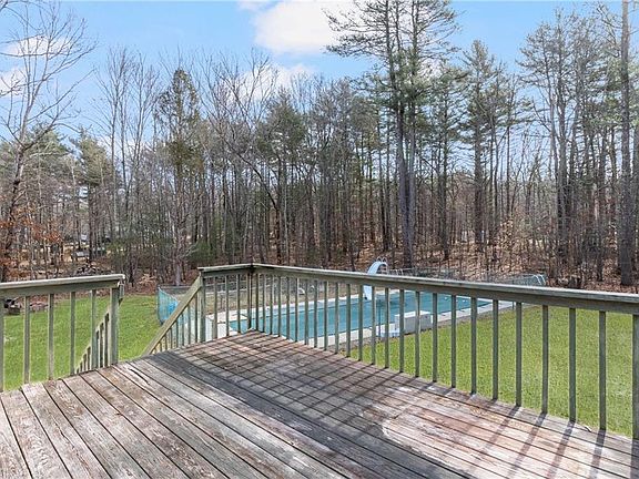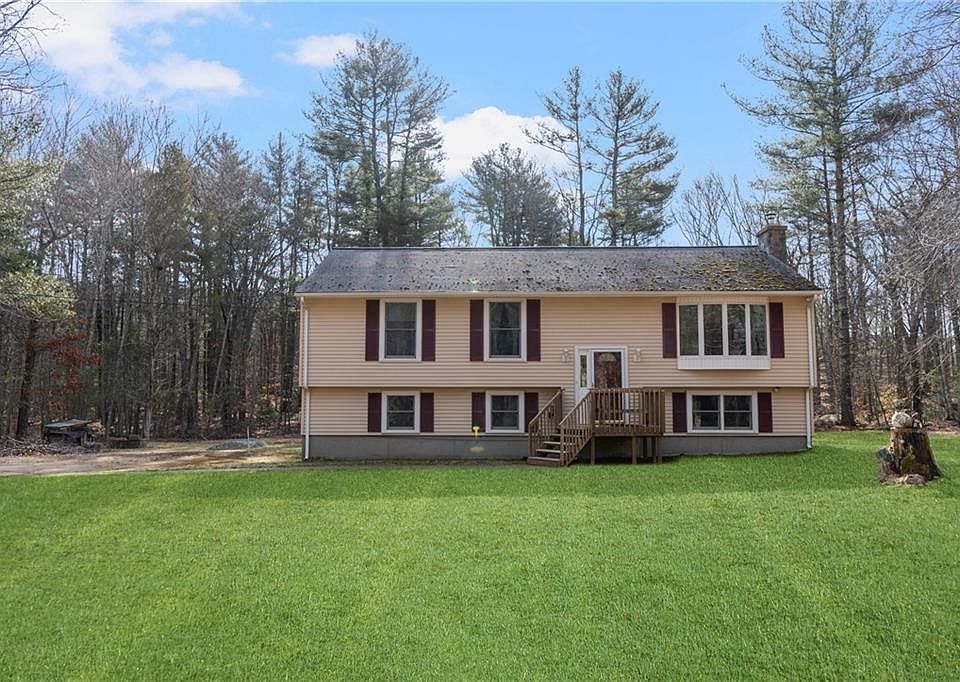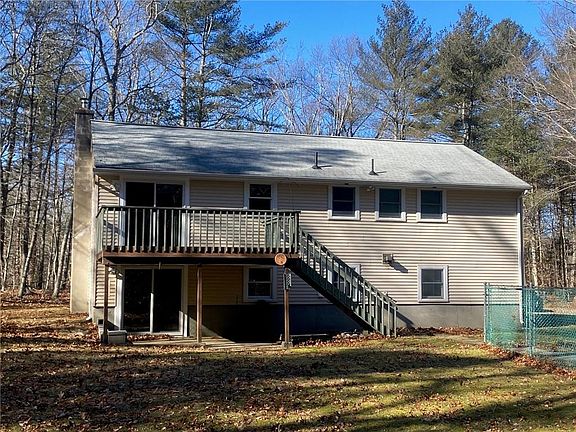 Peaceful, quiet, country living just minutes from the highway! Come check out this spacious home on two acres in desirable West Greenwich. Upstairs the kitchen, dining, and living areas are open with cathedral ceilings, bamboo wood floors, and a slider to a deck overlooking the back yard and inground pool. There's a full bath with double sinks and 3 bedrooms. The primary bedroom has a bathroom with shower stall. The lower level has a large family room with a full wall brick fireplace with a wood stove insert and sliders to the rear yard. There is also a finished room that could be used as an office or guest bedroom, and an integral garage.