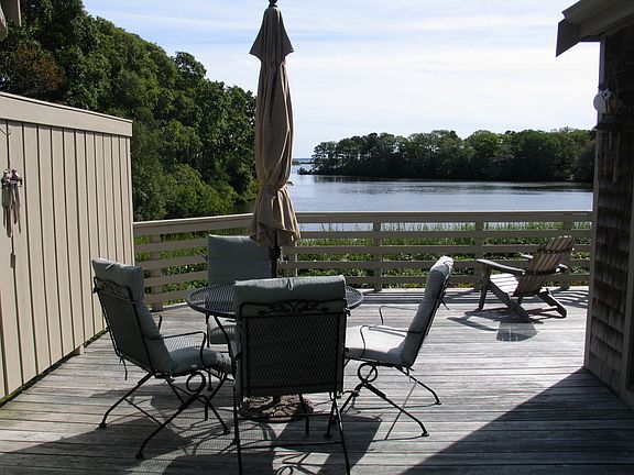 This Treetops Condominium is an elegant and spacious multi-level unit directly on Oyster Pond with a large waterfront deck and panoramic year-round views of Vineyard Sound. Nicely updated open floor plan with kitchen/dining area opening onto the waterfront deck. Many nice touches such as first floor laundry, fireplace, downstairs separate living space with a nice kitchenette and full bath. Walkout sliders to the water and association dock. Large master suite with great closets. Downstairs has a walk in cedar closet and lots of extra storage space. 2 assigned parking spaces plus guest spots.