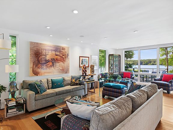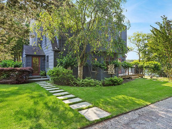 This exceptional waterfront property offers incredible views of Little Fresh Pond and a private dock. Whether enjoying magical sunsets with panoramic water views, sunbathing on the private dock, or launching a paddle board into the water, this is what dreams are made of. The property features a charming contemporary three-bedroom - four full bath, home with an elevator, four decks and a roof top hot tub all with gorgeous water views. The first floor has a stylish living room with a fireplace, glass doors leading to an expansive deck, a dining room and a stunning Chef's kitchen. The second floor consists of the primary en suite bedroom, a deck that leads to the roof top with the hot tub, and two additional bedrooms with a shared bath. The finished lower level offers a casual sitting area, additional full bath, and office with a glass door to the meticulously landscaped grounds, and accessory building.