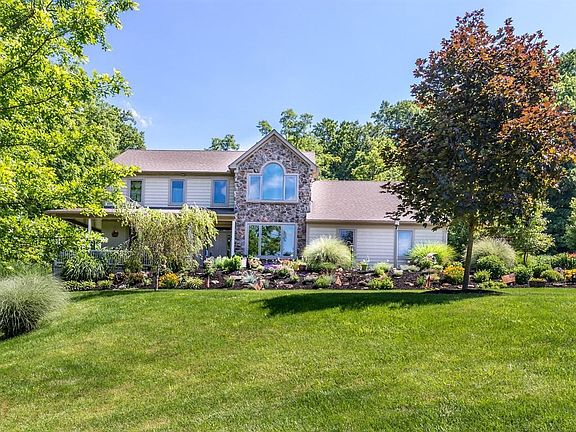 Rare opportunity for a one-owner custom built home on a gorgeous 2.48 AC lot with a stream. Offers open floor plan, true one-floor living if desired, custom kitchen cabinets, stainless appliances, wood floors. Main floor in-law quarters has bedroom, en suite bath w/ walk-in shower, living room & separate entrance & could also be used as a master suite & family room. Upstairs master suite w/ cathedral ceiling, palladium window, bath,& walk-in closet. Wraparound porch & large, tiered deck are perfect to take in the beautiful setting with extensive landscaping & give you plenty of space to relax & listen to the stream, watch birds, and enjoy nature. A 3 car garage and over-sized shed give you room for vehicles and storage. All new AC unit installed July 2016.