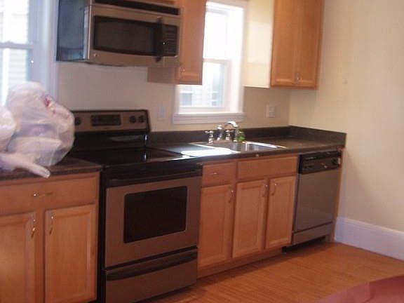 Please ask for the video! Listing broker does not charge a fee from a tenant. Renovated 4bdrms/1bth apartment 8 minutes walk to Davis T-stop and Tufts. Free laundry. This apartment is located on a tree-lined quite residential street near the bicycle path. Good size bedrooms with closets. Apartment is located on two floors, one full tiled bathroom, amazing big eat-in kitchen with maple cabinets, SS appliances including dishwasher and garbage disposal, built-in microwave, living room, gleaming hardwood floors, back &front porches. This is a great apartment in a great location. Backyard & garden are great in the spring & summer. Off-street parking and laundry is included a