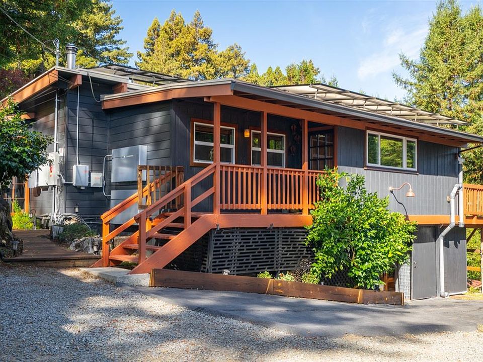 Escape to your very own 2-acre retreat, nestled among majestic redwoods, where tranquility and nature seamlessly converge. This charming home offers 2 bedrooms, 2 bathrooms, exposed redwood beam ceilings, newly installed waterproof cork flooring, a spacious living/dining area, a versatile media/office room, workshop, storage shed, ample parking along with a convenient covered carport. The property is not only picturesque with a terraced backyard, but also eco-friendly, featuring brand new solar panels with Enphase batteries and a remarkable 20,000-gallon rainwater catchment system. Step onto the deck and savor breathtaking views of the soaring ridgeline during the day, or indulge in stargazing at night while unwinding in the spa that features full body massage, five seat circuit magnet therapy and 100 watt 6 speaker stereo. This remarkable residence invites you to leave behind the hustle and bustle of everyday life and immerse yourself in a world of natural beauty. No matter the season, you'll be in close proximity to all that Sonoma County has to offer. Take a quick trip to explore Duncans Mills and the Russian River, dine at nutritious and delicious eateries, tour local wineries, hike scenic trails, or bask in the coastal waves and beaches.Don't miss out on this opportunity!