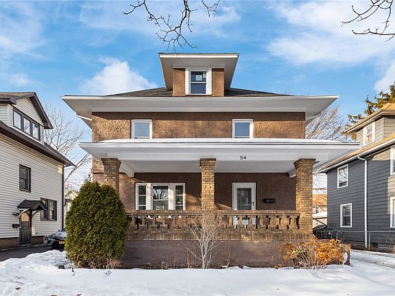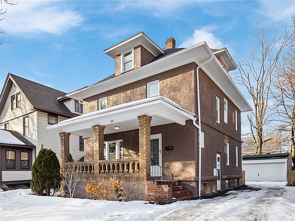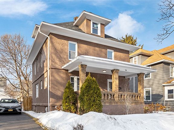 OUTSTANDING Rochester Foursquare, coveted FOUR BEDROOMS; RESTORED to suit the tastes & needs of any buyer! Charming STUCCO exterior leads to expansive open brick porch, asphalt driveway to TWO CAR Detached garage & Fenced backyard! Greet your guests in large Foyer w original HARDWOODS, Living room steps away offers brick FIREPLACE, neutral paint colors, flush mount light fixture! FORMAL DINING ROOM overlooking WATERFALL EDGE QUARTZ Breakfast Island! Recessed lighting shines down on NEW crisp white kitchen cabinets & quartz counters, complimenting backsplash, undermount sink! Brand New Kitchen Appliances on site STAY! Second story Houses spacious Master with double closet & ceiling fan, all FOUR Bedrooms boasting original refinished hardwoods, fresh paint, new fixtures! Feel luxurious in this modern monochrome full bath w FLOOR TO CEILING TILE SHOWER w on trend Single Glass Shower Panel, privacy window, black vanity w Gold fixtures! STORAGE SPACE OR BONUS SQ FT in expansive walk up third floor Attic! Basement houses HALF BATH & solid mechanics- NEW FURNACE, Glass block windows, PEX plumbing, Gas HW tank! ONE YEAR HSA HOME WARRANTY PROVIDED TO BUYER AS BONUS PEACE OF MIND! Take advantage of this incredible opportunity! Delayed Negotiations: Offers due 3/11/25 @ 1:00pm.